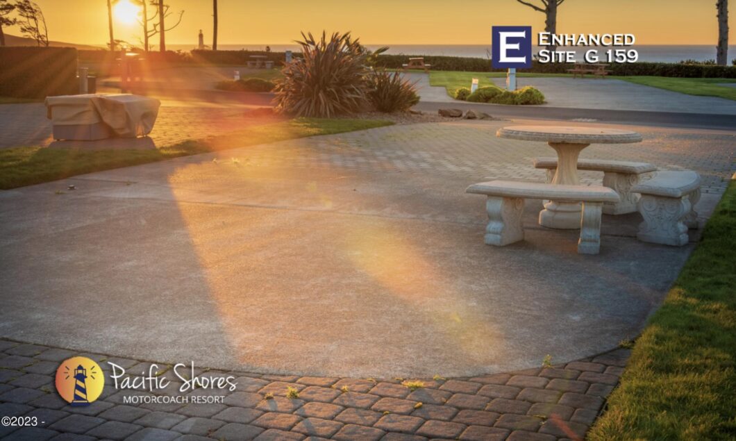 Beautiful Ocean View back-in lot with panoramic Pacific Ocean view. Watch whale spouts by day and the Yaquina Head Lighthouse flash at night. Expanded sitting area for your outdoor entertainment. There are wooded nature walking trail to an uncrowded beach. Pacific Shores offers, indoor/outdoor pools and spas, hot sauna. Owner’s only gym, kitchen and many more… Come and check out his beauty!