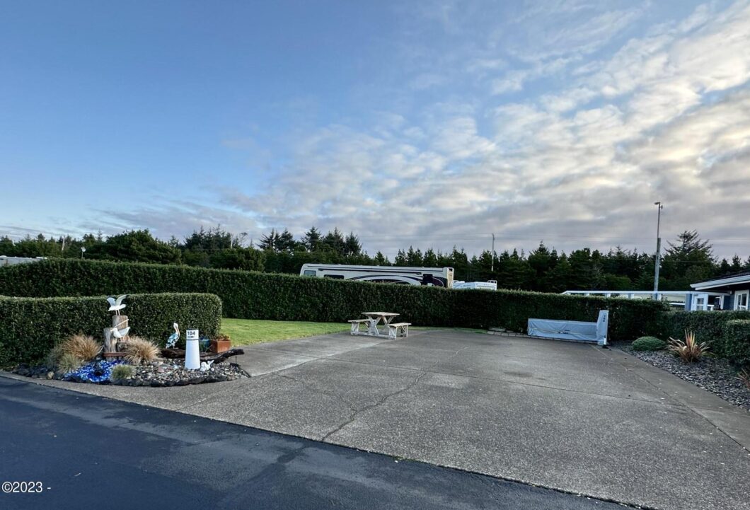 Huge back-in corner lot near outdoor pool and spa. Expanded sitting area and private hedges all around. Gated Pacific Shores Motorcoach Resort sets on a bluff overlooking an uncrowded beach; there is trail access to the beach from the Resort. This is an amenity rich Resort with pools, hot tubs, saunas, and a social hall with a panoramic ocean view. Sit around the fireplace with friends or workout in the owner’s exercise room.