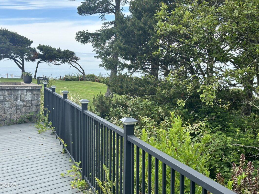 Spectacular Ocean View lot! Raised decking area for entertaining enjoyable and easy. Deck rail with solar lights on top of the posts. Another feature to this unique setting, highlighting the incredible ocean and forest view making this pull in lot a rare commodity on the market! Pacific Shores Motorcoach Resort is located on a bluff overlooking the ocean and has a lighthouse view. Nature walking trails through the wood and access to an