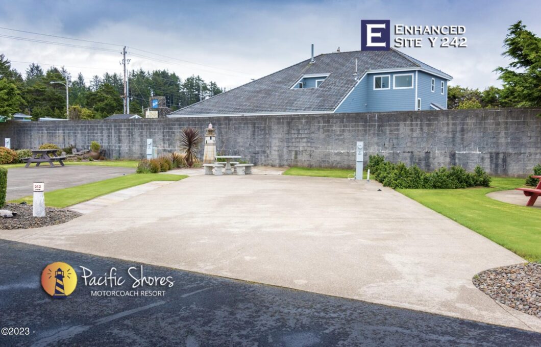 Lot 242 is back in lot against the wall (no neighbors behind the wall), expanded sitting area for outdoor entertainment. Easy in and out of the lot. Pacific Shores Motorcoach Resort is located on a bluff overlooking the ocean and has a lighthouse view. Nature walking trails through the wood and access to an uncrowded beach. A large clubhouse and owner’s only lounge, gym and kitchen. Indoor/outdoor pools and spas and hot sauna.
