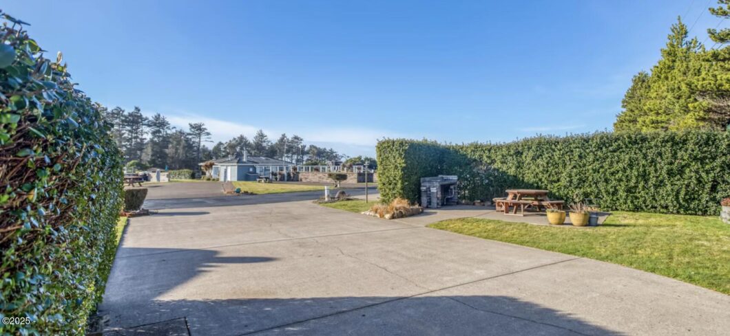 Back in lot; huge corner lot with tall mature hedges for privacy; expanded sitting area; BBQ or food preparing stand. If you need privacy, this is the one! Pacific Shores Motorcoach Resort is located on a bluff overlooking the ocean and has a lighthouse view. Nature walking trails through the wood and access to an uncrowded beach. A large clubhouse and owner’s only lounge, gym and kitchen. Indoor/outdoor pools and spas and hot sauna.